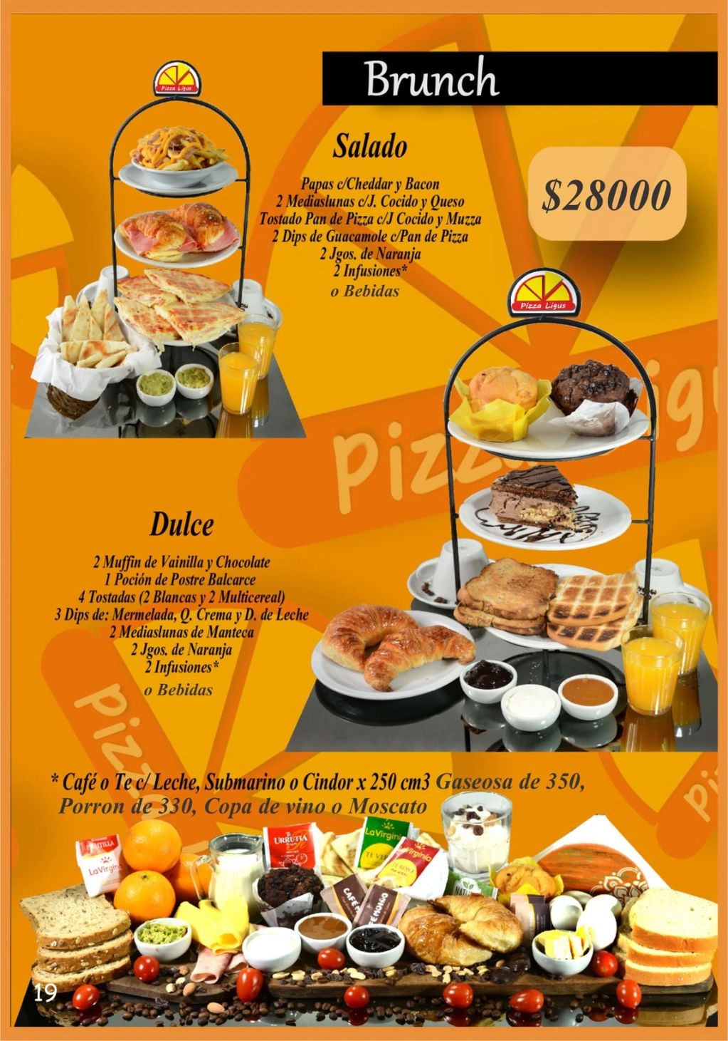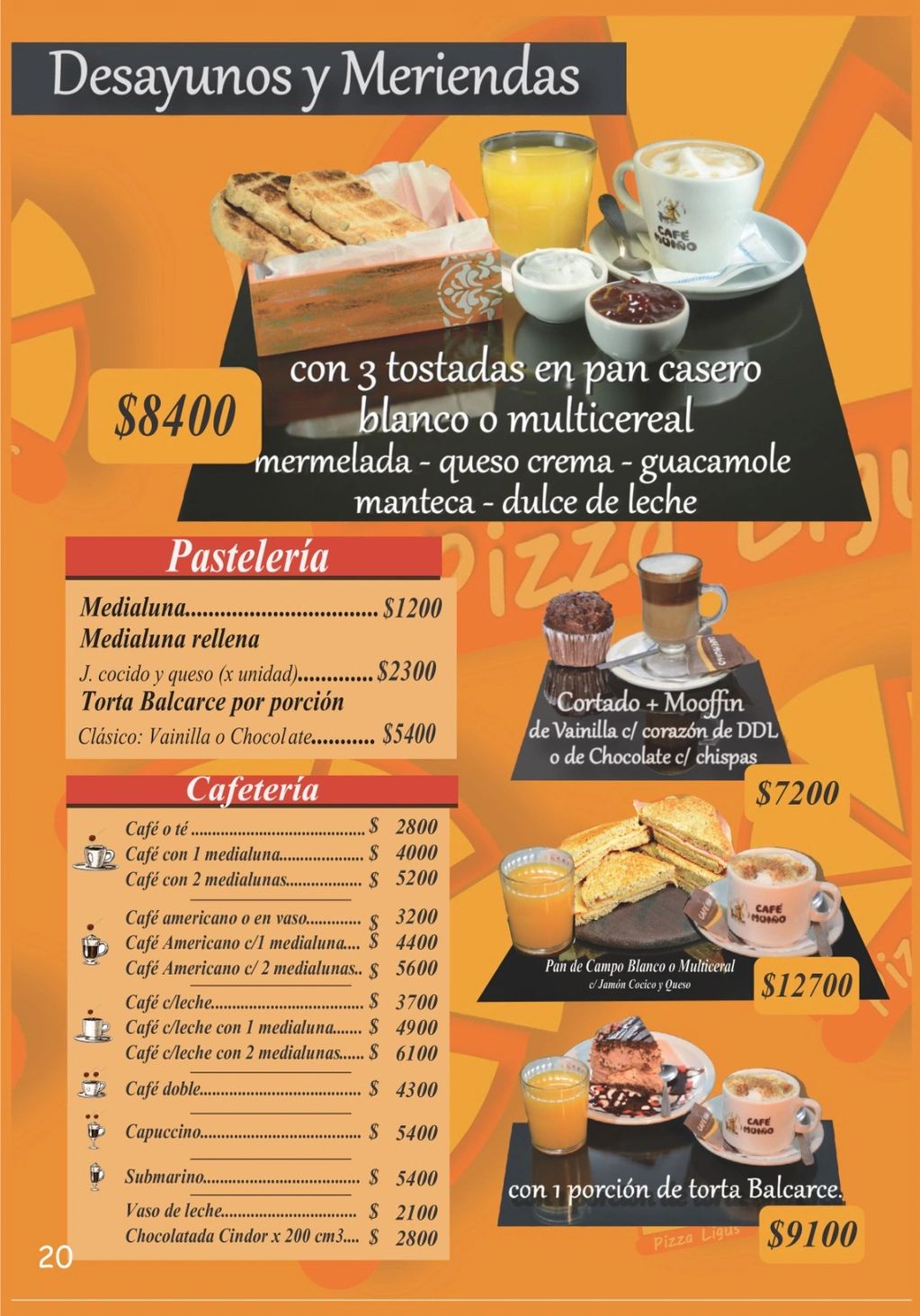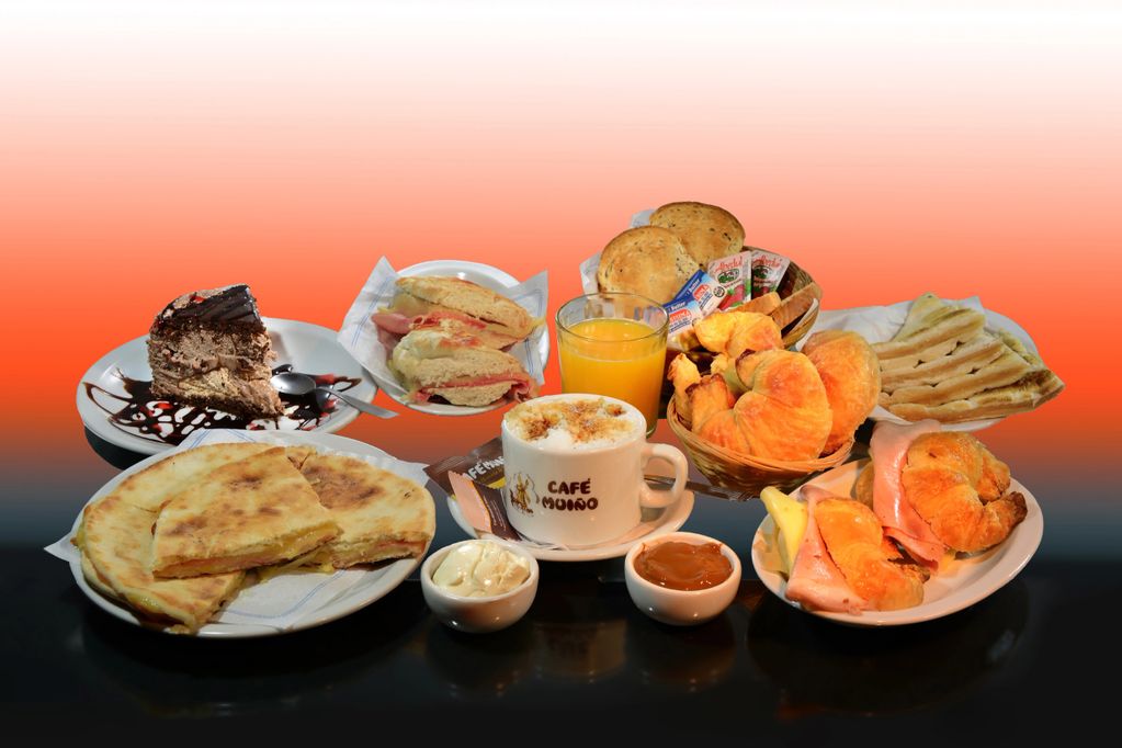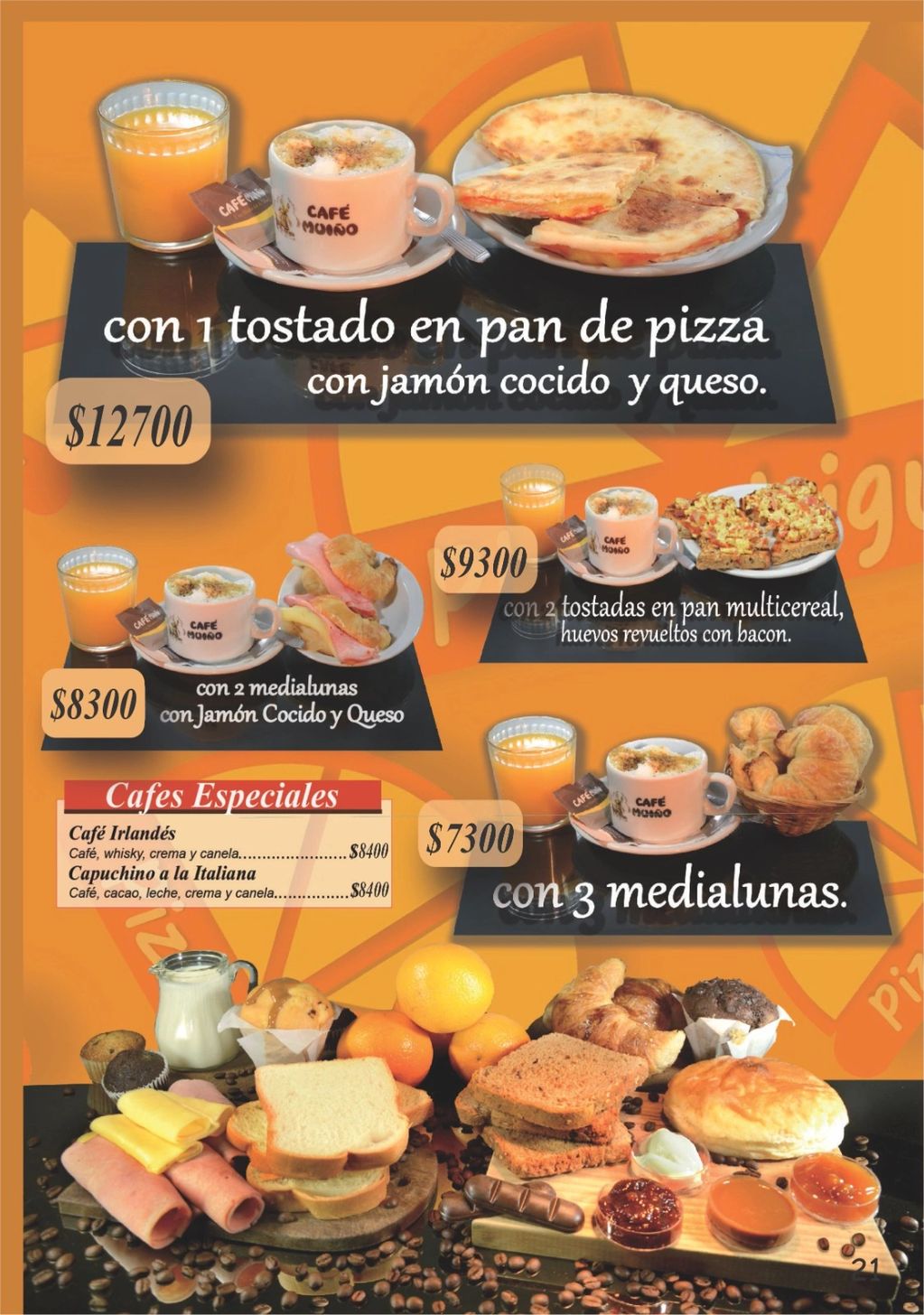 Cafe o te c/leche acompañado con medialunas, tostadas de pan caserito blanco o c/multicereal, con queso crema, manteca y dulces, tostados en pan de pizza o miga, medialunas con jamon y queso y exquisitas tortas